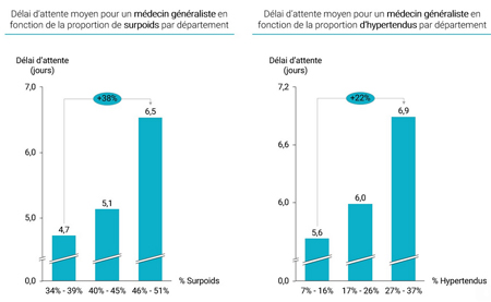 L’intérêt de cette étude est d’identifier les régions dont l’état de santé et l’accès aux soins seraient tous deux en dessous de la moyenne nationale afin d’alerter sur les régions les plus à risque face au phénomène des déserts médicaux. L’étude s’est par ailleurs concentrée sur la médecine générale pour le rôle charnière que celle-ci joue dans le suivi de conditions comme l’obésité ou l’hypertension. Or les régions dans lesquelles le délai d’attente est élevé pour un médecin généraliste comprennent un pourcentage d’hypertendus et d’individus en surpoids supérieur à la moyenne.