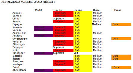 Jaune tendre : Egalement obligatoire, il sera profitable aux concurrents qui souhaiteront réaliser deux pit-stops.