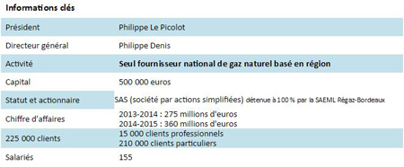 2016 : 225 000 clients, dont 15 000 professionnels dans la France entière (présence dans ¼ des communes françaises desservies en gaz), pour un volume de 10 Térawattheures.