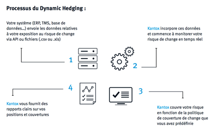 La valeur ajoutée de Dynamic Hedging repose sur le monitoring en temps réel du risque de change afin de permettre aux entreprises de se prémunir contre ce risque de façon dynamique et automatique. Dynamic Hedging évite ainsi aux entreprises effectuant de nombreuses transactions en devises d’avoir à réaliser manuellement et individuellement chacune de ces opérations pour couvrir leur risque de change. Cette solution se traduit par une optimisation de la gestion des devises et de l’efficacité interne de l’entreprise.
