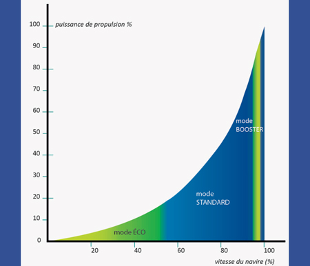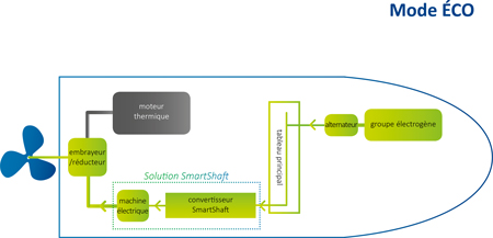 Le concept SmartShaft® consiste à propulser le navire et produire de l’électricité à partir d’une machine électrique tournante réversible. Cette solution se décline en trois modes de fonctionnement, chacun dédié à une utilisation du navire : en mode éco, lorsque le navire est à vitesse lente, l’hélice est entrainée par la machine électrique tournante fonctionnant en moteur ; le moteur diésel est stoppé. Cette configuration offre une souplesse d’utilisation, la consommation de carburant est réduite ainsi que les émissions de gaz polluants. La réduction du bruit et des vibrations augmente le confort de l’équipage. En mode standard, (patrouille), le moteur thermique entraîne l’hélice ainsi que la machine électrique tournante qui fonctionne alors en mode générateur pour alimenter le réseau bord ; le groupe électrogène est alors stoppé. L’optimisation du taux de charge du moteur thermique et l’arrêt du groupe électrogène permettent des économies de carburant et une réduction de l’impact environnemental. En mode booster, à vitesse rapide, le moteur thermique peut délivrer toute sa puissance maximale à l’hélice. L’énergie électrique est alors fournie par le groupe électrogène. Cette configuration permet d’appliquer le maximum de puissance sur l’hélice pour une vitesse maximale.