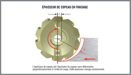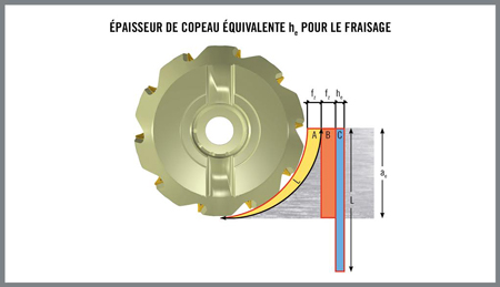 Nombre de fabricants ne comprenant pas bien l’importance de l’épaisseur de copeau surchargent ou sous-utilisent leurs outils coupants, ce qui influe négativement sur leur productivité et sur la durée de vie de leurs outils. Des modèles mathématiques aident à comprendre l’importance fonctionnelle de l’épaisseur de copeau. Les premiers modèles d’épaisseur de copeau étaient de simples équations décrivant les copeaux produits dans les opérations en tournage constant. Les modèles d’épaisseur de copeau, pour l’environnement d’usinage interrompu du fraisage, ont évolué pour tenir compte d’un nombre croissant de variables et pour produire des résultats de plus en plus précis. Un modèle d’épaisseur moyenne de copeau pour le fraisage Dans les opérations de tournage continu, l’épaisseur de copeau reste inchangée. En fraisage, toutefois, l’épaisseur des copeaux change continuellement à mesure que l’arête de coupe pénètre et ressort de la pièce à usiner.