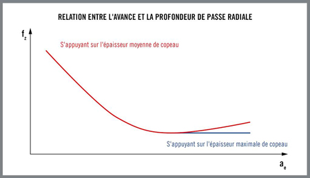 À de faibles profondeurs de passe radiale, l’évacuation des copeaux ne constitue pas un problème, et l’avance maximale est limitée par l’ampleur de l’effort de coupe que les éléments du système d’usinage peuvent supporter. En revanche, l’évacuation des copeaux devient problématique à de plus grandes profondeurs de passe radiale, qui produisent un volume de copeaux excédant la quantité pouvant être évacuée de manière sûre.