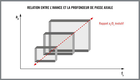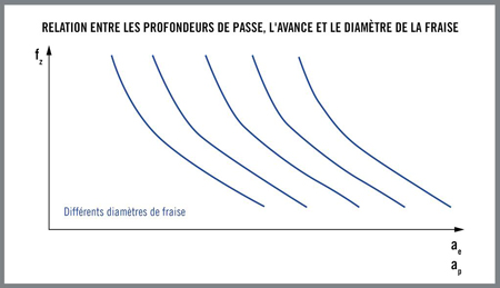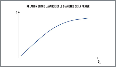 Dans une autre situation, la Figure 5 décrit la relation entre le diamètre de fraise (axe horizontal) et l’avance (axe vertical). Le graphique montre qu’en augmentant le diamètre d’une fraise, sa plus grande force permet d’utiliser des vitesses d’avance supérieures. Le calcul informatisé du modèle d’épaisseur de copeau équivalente permet de quantifier facilement cette relation et de tirer parti de la productivité accrue offerte par des avances plus élevées.