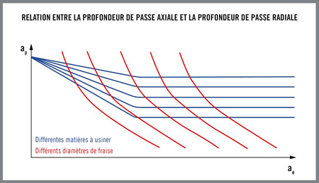 À des profondeurs de coupe radiale inférieures, la limite correspond à la charge sur la fraise, tandis qu’à des profondeurs de coupe radiale supérieures, cette limite correspond à la quantité de copeaux pouvant être évacués de manière sûre. L’équation d’épaisseur de copeau équivalente met en balance l’influence des deux critères limitatifs. Les calculs nécessaires à la modélisation de l’interaction des combinaisons de profondeur de passe et de vitesse d’avance définissant les limites d’évacuation des copeaux s’avéreraient complexe et onéreux s’ils étaient effectués manuellement, alors que des calculs informatiques fournissent des résultats instantanés.