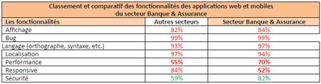 Parmi les fonctionnalités générales, la performance est moins bien traitée dans le secteur bancaire et est critiquée à 70% contrairement aux autres secteurs qui sont autour de 55%.