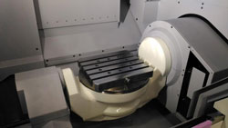 On sous-estime souvent l’importance d’une gestion efficace du réfrigérant sur les centres d’usinage verticaux (VMC), alors qu’il s’agit là d’une nécessité absolue lorsqu’une machine est conçue pour de hauts niveaux de productivité, et génère en conséquence de hauts volumes de copeaux par minute. Contrairement aux configurations de table 5 axes habituelles de type tourillon, disposant de deux trous étroits de chaque côté du tourillon, pour l’évacuation des copeaux, le DA300 est pourvu d’un tourillon largement ouvert et d’un large passage situé sous la table. Les copeaux sont ainsi amenés à tomber directement dans le passage ainsi pratiqué. Le système de gestion du réfrigérant sur le DA300 est exceptionnel. Le réfrigérant s’écoule abondamment par la buse de refroidissement et par le système de nettoyage des carters, éliminant ainsi l’accumulation de copeaux et permettant leur évacuation optimale.