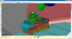 Une programmation WorkNC en 3+2 avec les transitions de parcours ont permis de piloter le centre d’usinage ROMI DCM620-5F. Les parcours 3 axes ont été propagés automatiquement en parcours 3+2 suivant la topologie de la pièce. L’utilisation des outils Sandvik Coromant dont la nouvelle fraise CoroMill® 390 à grande avance ont parfait cette démonstration. WorkNC dispose de plusieurs outils pour s’assurer que les angles nécessaires aux parcours 3+2 axes peuvent être obtenus sans collision sur une machine spécifique.