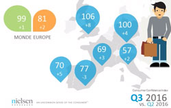 L’Europe a montré lente remontée de la confiance des consommateurs : une augmentation d’un point au 2e trimestre puis de deux points au 3e trimestre permettent à la région de retrouver son score de l’année précédente (81).