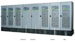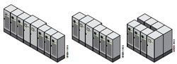 Une autre solution ASI évolutive est dotée de la technologie Green Power 2.0 : la gamme MODULYS GP. Le principe reste le même : la puissance produite par une armoire MODULYS GP peut évoluer de 25 à 200 kW par ajout de modules de puissance qui s’empilent verticalement au sein même de l’armoire.. La nouveauté, c’est la modularité horizontale : il est désormais possible d’associer jusqu’à trois armoires en parallèle pour obtenir un système capable de délivrer une puissance totale de 600 kW. Conçue sans aucun nœud de fiabilité, la solution permet une redondance totale N+1 ou N+2.