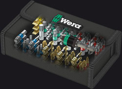 De plus, Wera a facilité le système pour retrouver les embouts dans le Bit-Check. C’est pour cela qu’a été conçu le récupérateur d’outils « Take it easy », qui est la cause des embouts bien colorés des séries Impactor, Inox, Bi-torsion et Diamant. Les embouts sont assimilés à des profils spécifiques grâce à des bandes colorées. Ainsi, le rouge symbolise l’empreinte PH, le noir symbolise l’empreinte PZ, le vert l’empreinte Torx, le bleu pour l’empreinte à six pans creux et le jaune symbolise l’empreinte tête fendue. Les tampons supplémentaires permettent de distinguer facilement les tailles les unes des autres. Grâce à ce marquage visible, il est possible de trouver le bon embout en quelques secondes, même dans des Bit-Checks bien fournis.