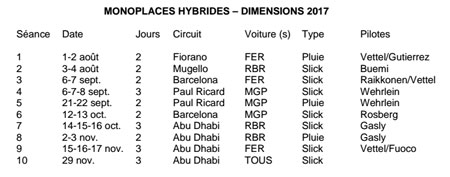 TESTS. Grâce aux changements effectués par la FIA dans son règlement sportif, le développement des pneumatiques 2017 a pu être réalisé au cours de 10 séances d’essais, soit 24 journées de roulage cumulées. Le programme de tests, effectué avec des monoplaces hybrides, a débuté début août, et s’est conclu la semaine dernière à Yas Marina avec Ferrari. Le mardi après le Grand Prix d’Abou Dhabi (29 novembre), enfin, les monoplaces hybrides de Ferrari, Mercedes et Red Bull prendront pour la première fois la piste ensemble.