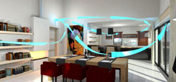 L’évacuation de l’air pollué par les sorties d’air dans les pièces humides grâce à un système de balayage et une légère surpression. Cette dernière permet également de bloquer les remontées de radon et les infiltrations de flux d’air parasites.
