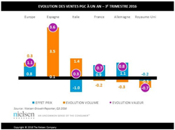Au 3e trimestre 2016, les prix des PGC ont augmenté de +0,8% en 1 an, tandis que les volumes ont eu une évolution de +0,3%. Par conséquent, le chiffre d’affaires en sorties caisses progresse de +1,1%, un taux de croissance parmi les plus bas enregistrés en 8 ans.