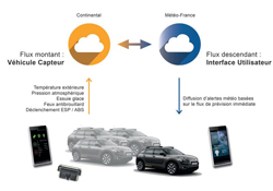Grâce aux éléments de télématique embarqués et à l’architecture connectée développés par Continental, le véhicule collecte et transmet des informations sur les conditions météo (température, pression atmosphérique, précipitations via le déclenchement des essuie-glaces), sur l’état de la surface de la route (ABS/ESP) et sur la visibilité (phares, feux antibrouillard). Ce flux montant de données permet à Météo-France de proposer à ses clients un service d’alertes météo optimisé (alertes géo-localisées, risques météorologiques en temps réel) et adapté à la conduite grâce à l’interface utilisateur développée par les équipes Design et R&D de Continental à Rambouillet. Celle-ci affiche sur l’écran une feuille de route interactive avec des informations de sécurité et des renseignements utiles le long du parcours, diffuse des alertes visuelles et vocales et permet au conducteur d’évaluer l’état de la route. L’analyse des données fournies par le véhicule affine la qualité des prévisions à très court terme (0-3h) et permet de proposer des systèmes d’alertes optimisés et plus pertinents.