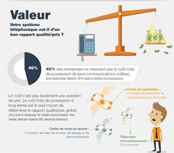 Le premier critère à évaluer est le rapport qualité/prix. En effet, ce que les entreprises attendent avant tout de la part d’un système téléphonique, c’est qu’il ne leur coûte pas plus cher que ce qu’il leur rapporte. Pourtant, 46% des entreprises sont encore incapables de mesurer le coût total de possession de leurs communications unifiées1, seul moyen de déterminer le rapport qualité/prix global.