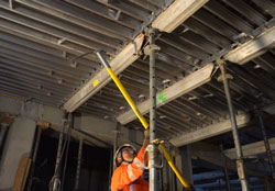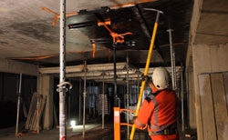 Pour couler une dalle entre deux étages lors de la rénovation ou de la construction d’un bâtiment neuf, on réalise un coffrage avec des panneaux étanchéifiés, disposés sur une structure soutenue par des étais. Après avoir coulé le béton et une fois la prise terminée, il faut démonter la structure sous la dalle. C’est là qu’intervient le nouveau décoffreur Leborgne nanovib, dont le long manche permet de travailler directement au sol, sans avoir recours à une PIR (Plate-forme Individuelle Roulante). Avec la surface de frappe, on desserre d’abord les écrous des étais sous les panneaux afin de retirer la structure porteuse. Ensuite, les plaques de coffrage fixées au plafond sont décollées avec la panne de l’outil. La finesse du décoffreur Leborgne nanovib lui permet de se glisser entre le plafond et la plaque de coffrage, son galbe de faire levier afin de la décoller et sa longueur de se tenir éloigné de la zone de chute, limitant ainsi les risques d’accident.