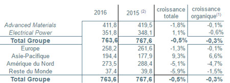 Les ventes du pôle Advanced Materials se sont élevées à 412 millions d’euros, en ligne avec celles de 2015 à périmètre et changes constants. Cette situation reflète une baisse de la chimie au 1er semestre qui a été compensée par une bonne performance sur les marchés des énergies renouvelables, de l’aéronautique et de l’électronique.