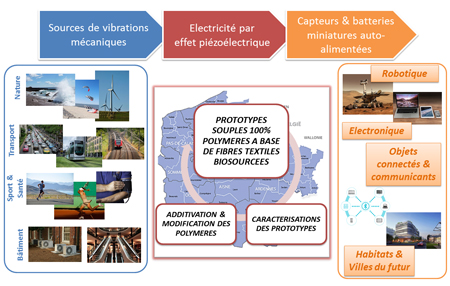 Le Département de Recherche TPCIM (Technologie des Polymères et Composites & Ingénierie Mécanique) d’IMT Lille Douai et ARMINES pilote depuis octobre 2016 le projet BIOHARV (Textiles biosourcés piézoélectriques pour la production d’énergie électrique) regroupant 6 partenaires*, financé par l’Europe dans le cadre de l’appel à projet INTERREG V FWVL avec le cofinancement de la Région wallonne, de la Région Flandre Occidentale, l’Agence Flamande de l’Innovation.