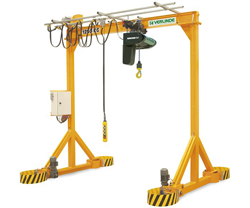 Situés de part et d’autre du portique, chaque moteur entraine une roue, tandis que les deux autres roues sont libres. Il est ainsi facile de diriger le portique et de le faire pivoter sur lui-même, par inversion de marche des moteurs. Comme le VGI, le VGIM est fabriqué par mécano-soudure et il bénéficie d’une finition de couleur jaune en "polyuréthane RAL 1028". Sur le profilé supérieur se déplacent le chariot et son palan, alimentés par une guirlande électrique et commandée par la boîte à bouton qui permet toutes les manœuvres de déplacement et de montée/descente de la charge. Enfin, pour s’adapter parfaitement à l’environnement de travail, de nombreuses options sont possibles, comme par exemple une ligne d’alimentation avec enrouleur et sectionneur, une radio commande, des batteries pour rendre cette unité de levage autonome,...