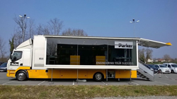 Construit sur une plate-forme de véhicule, conforme à la norme Euro 6 et économe en carburant, ce camion d’exposition offre une surface de présentation de 50 m² entièrement climatisée, confortable, lumineuse et aérée. Cinq axes à commande hydraulique sont embarqués et sont pilotés par la technologie Parker et plus particulièrement par le nouveau système de pompe électro-hydraulique (EHP) comprenant un servomoteur GVM (Global Vehicle Motor) couplé à une pompe hydraulique et piloté par le variateur MC associé.