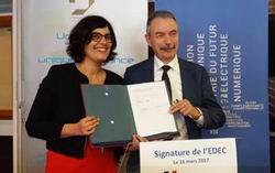 La cérémonie, organisée avec les cinq fédérations de la filière du THD (Très Haut Débit) réunies au sein d’OBJECTIF FIBRE, s’est déroulée en présence de Madame Myriam EL KHOMRI, Ministre du Travail, de l’Emploi, de la Formation Professionnelle et du Dialogue Social. A leurs côtés, les responsables des branches professionnelles représentant la filière du déploiement du très haut débit équipementiers, installateurs et opérateurs ont signé avec l’Etat le contrat cadre EDEC.