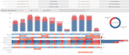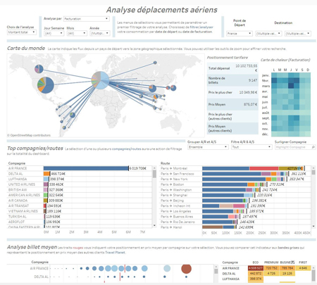 La compagnie de voyage utilise Tableau pour un usage externe à travers la création d’un portail unique Click & Control qui permet à chaque utilisateur d’analyser ses déplacements en temps réel (J+1). Ainsi, un Travel Manager pourra se connecter facilement et de façon sécurisée à l’ensemble de ses données de voyage (taux de réservation en ligne ; consommation par mois ou par types de prestation ; analyse des déplacements aériens par montant, période ou prix moyen ; définition des routes les plus consommées ; comparaison des paniers moyens, etc.). Cela représente 160 000 comptes Tableau actifs au sein de Travel Planet et près de 300 data visualisations interactives régulièrement consultées.