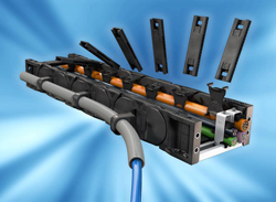 Tout comme la gaine annelée, la chaîne porte-câbles se distingue par une mise en place rapide et aisée sur la machine. De plus, les entretoises ouvrables amovibles des deux côtés permettent une mise en place simple des câbles et conduits dans la chaîne porte-câbles E4.1. En présence d’espaces réduits, les utilisateurs bénéficient également de la grande stabilité, de la robustesse et du faible niveau sonore de la E4.1. Les nouvelles flasques peuvent aussi être combinées à la version R4.1 fermée. En fonction de ses besoins, l’utilisateur peut piocher dans le système modulaire universel E4.1 et combiner aux flasques différents types d’entretoises ouvrables, de couvercles et de fonds, de séparateurs, d’étriers, et maintenant aussi de systèmes à clips.