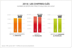 Rappel des chiffres 2016 de la propriété industrielle en France :