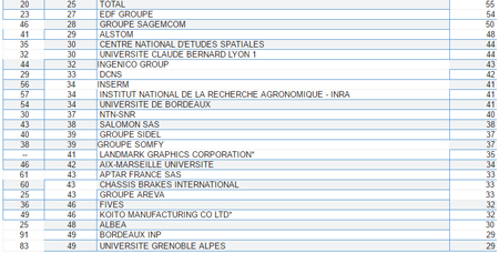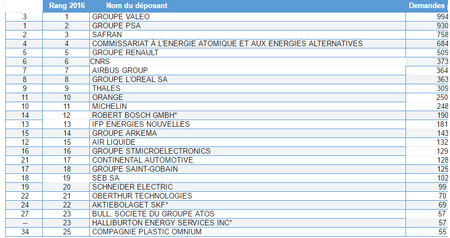 Les 9 premiers déposants restent les mêmes que l’an dernier, avec toutefois un changement de places sur le podium : l’équipementier automobile Valeo ravit la 1ère place au constructeur PSA, avec 994 demandes de brevets publiées, contre 668 en 2015. Valeo a plus que doublé son nombre de demandes de brevets publiées en 2 ans. Le groupe PSA, qui occupait le 1er rang du classement depuis 2007, est donc 2e cette année avec 930 demandes publiées (1 012 l’an dernier). Le groupe aéronautique Safran passe, lui, de la 2e à la 3e position, avec 758 demandes publiées (769 en 2015). Les déposants des rangs 4 à 9 restent les mêmes que l’an dernier. Le groupe de télécommunication Orange, absent du Top 10 depuis 2007, se classe cette année au 10e rang avec 250 demandes publiées, au détriment de Michelin, qui se classe 11e.