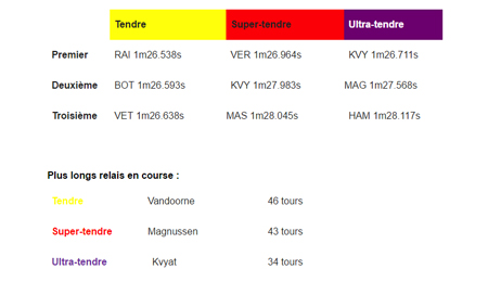 Sebastian Vettel s’impose au prix d’une stratégie à un arrêt, chaussé des gommes ultra-tendres jusqu’au 23e tour. Nous avions cependant imaginé que la majorité s’élancerait en super-tendres, et le mieux classé selon cette tactique se révèle être Max Verstappen, 5e.