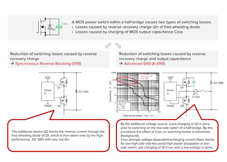 A-SRB est une nouvelle technologie développée par Toshiba, qui réduit radicalement les pertes de commutation et qui peut servir à tout un éventail d’applications, notamment aux inverteurs PV, aux convertisseurs DC/DC, aux circuits de compensation PFC (Power Factor Correction, ou compensation de facteur de puissance), ou aux commandes moteur.