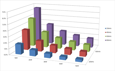 Pour démontrer l’efficacité de la technologie A-SRB, des simulations SPICE au niveau dispositif d’un pont d’inverteur (topologie H4) ont été réalisées avec et sans A-SRB. La Figure 2 illustre l’amélioration du rendement dans le cas d’une modulation bipolaire, à différents niveaux de puissance et de fréquences de commutation, grâce à la technologie A-SRB. Le transistor de commutation est un Toshiba DTMOS IV à faible RDS(on) (100A, 600V). Etant donné que la technologie A-SRB réduit les pertes de commutation, l’amélioration du rendement est la plus spectaculaire aux fréquences de commutation élevées. Le gain de rendement maximal dans le cas de cet exemple est d’environ 6%.