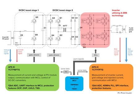 En s’appuyant sur la technologie A-SRB, Toshiba a développé une solution système pour inverteurs PV, avec une puissance de sortie jusqu’à 5kW. Elle se compose de quatre éléments principaux, un pont inverteur en technologie A-SRB, un MCU pour contrôler l’ensemble du système, et deux CI frontaux analogiques (AFE pour Analog Front End en anglais) pour contrôler les étages d’entrée du convertisseur continu-continu, ainsi que la sortie de l’inverteur. En plus des gains de rendement obtenus grâce à la technologie A-SRB, ces deux frontaux analogiques à haut niveau d’intégration permettent d’obtenir un inverteur compact et économique.