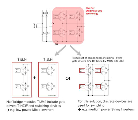 Le coeur du système, l’inverteur à fonctionnalité A-SRB, peut être construit de plusieurs manières, selon le niveau de puissance. Pour les MI jusqu’à d’environ 300W de puissance d’entrée, Toshiba propose le module T1JM4 intégrant un demi-pont complet, avec des drivers de grille à transistors de commutation A-SRB et des diodes Schottky SiC. Pour des inverteurs PV de puissance nominale plus élevée, jusqu’à environ 5 kW, des drivers de grille et des dispositifs de commutation discrets peuvent être fournis sous forme de kit.