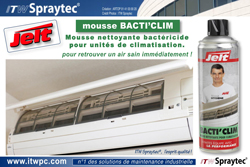 Développé par ITW Spraytec et commercialisé sous la marque JELT, BACTI’CLIM est un nouveau nettoyant, désinfectant bactéricide sous forme de mousse, destiné à l’entretien des unités de climatisation. La mousse BACTI’CLIM permet d’éliminer les salissures, les virus, les bactéries et les champignons afin de restituer un air intérieur totalement sain.