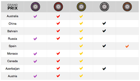 Les équipes sont libres de choisir parmi les 10 trains restants à leur disposition (à l’exception des cinq premiers Grands Prix, jusqu’en Espagne, où Pirelli alloue chaque set), aux nombres de 13 pour le week-end.