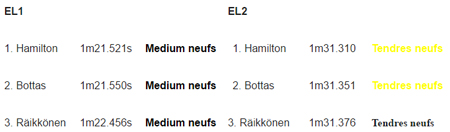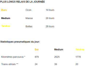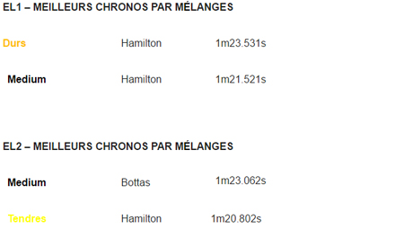 Les Mercedes occupent aujourd’hui, à l’issue des essais libres, le sommet de la hiérarchie devant Ferrari et Red Bull, toutes deux chaussées des gommes medium, puis tendres. Les pneumatiques durs et medium sont utilisées durant les EL1, les teams privilégiant l’emploi des tendres pendant les EL2 qui offrent des conditions plus représentatives. La journée d’hier ayant été perturbée par la pluie, les averses ont nettoyé l’asphalte de la gomme déposée auparavant, mais ce vendredi a été marqué par un ciel clément et des températures assez élevées, de 27°C dans l’air et 42°C sur la piste en EL2.