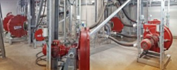 À cette fin, les cendres sont mélangées à 35 % d’eau, puis acheminées dans des cuves de dosage (chacune dotée d’une conduite de recirculation) à travers un réseau de conduites de 650 m, pour être enfin injectées dans les moulins à granulés. À l’intérieur, pour éviter le tassement, quatre pompes Bredel 80 sont installées pour l’acheminement de la bouillie de cendres, laquelle est ensuite dosée à partir de la conduite de recirculation dans une chaudière Babcock. La bouillie de cendres est dosée par quatre moulins à granulés, chacun équipé d’une pompe Bredel 40. Au total, l’installation compte 21 pompes Bredel de tailles variées, certaines restant en fonctionnement continu.