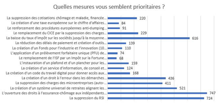 Legalstart.fr a interrogé 1099 clients créateurs et chefs d’entreprise de sa base de données pour savoir quelles sont les mesures qui leur semblent prioritaires et lesquelles ils estiment ne pas être nécessaires.