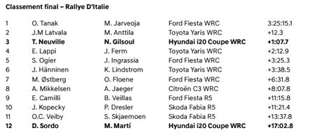 Avec quatre meilleurs temps durant cette épreuve, Dani Sordo et son copilote Marc Martí ont montré un grand potentiel tout au long des trois jours de course. C’est leur plus grand total sur une même épreuve depuis leur arrivée chez Hyundai Motorsport. Ils doublent également leur nombre de points gagnés lors des Power Stage avec une deuxième place.