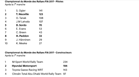 Hayden Paddon s’est installé en tête dès la première étape en devançant Thierry Neuville. Samedi, alors qu’il comptait près de dix secondes d’avance, il a pourtant mis fin à sa journée après avoir heurté un talus dans l’ES13. Gêné par des soucis de freins, Thierry Neuville a perdu plus d’une minute dans l’après-midi pour tomber au troisième rang. Quant à Dani Sordo, un problème de turbo lui a coûté plusieurs minutes dès la première étape.