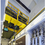 Que ce soit en poids ou en encombrement, les équipements du poste d’alimentation Lamarck sont hors normes et nécessitent des moyens adaptés pour leur manipulation. Un pont roulant Verlinde a été mis en place en avril 2011, en remplacement d’un matériel vieux de plus de quarante ans. Afin de répondre à plusieurs besoins, ce nouveau pont roulant est équipé de deux palans. L’un, à double crochet, est capable de soulever une charge de 70 tonnes. L’autre, est un palan auxiliaire acceptant une charge de 10 Tonnes. Se déplaçant sur le même chemin de roulement, ces deux palans sont parfaitement complémentaires.