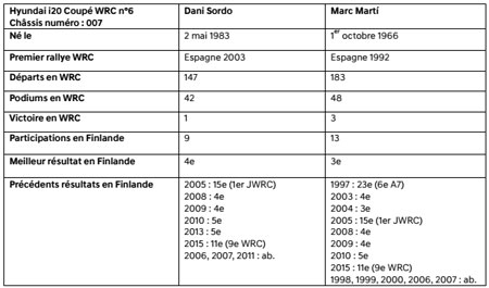 La quatrième position de Dani Sordo et de son compatriote Marc Martí en Pologne a assuré à Hyundai Motorsport un nouveau record de points marqués en WRC. En Finlande, les Espagnols auront l’objectif de gagner une place pour monter sur le podium de ce rallye ultrarapide. Dani Sordo : « Après nous être approchés du podium en Pologne, nous visons un top 3 en Finlande. Nous avons connu des hauts et des bas jusqu’ici avec des résultats positifs et des moments plus compliqués. Nous avons eu des problèmes sur certains rallyes qui ont gâché notre progression, mais nous restons très déterminés. Nous voulons poursuivre cette seconde moitié de saison sur une note positive. Le Rallye de Finlande est une course difficile, mais nous ferons de notre mieux pour marquer des points au classement des Pilotes et des Constructeurs. »