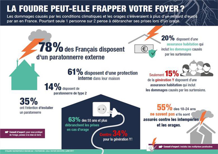 L’étude révèle que 78% des Français sont équipés d’un paratonnerre externe, mais qu’une seule personne sur deux pensent à débrancher les prises en cas d’intempéries. Même si 64% des personnes interrogées déclarent disposer d’une protection interne contre les orages, les experts recommandent une solution plus sécurisante : la mise à la terre.