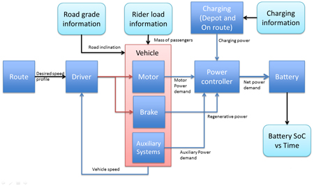 Comme étape initiale vers la migration de capacité, l’équipe de modélisation du CNRC a collaboré avec l’équipe des Solutions d’ingénierie Maplesoft pour créer un modèle extrêmement fidèle de dynamique de bus électrique alimenté par batterie en prenant en compte divers facteurs impactant les décisions opérationnelles. L’ensemble de ces facteurs est nécessaire pour répondre aux nombreuses préoccupations des exploitants de transports en commun et pour progresser vers un système d’un nouveau genre. Par exemple, les exploitants de transports en commun ont besoin de connaître la durée de disponibilité d’un bus électrique par rapport à un bus à moteur Diesel pour planifier les horaires et rationnaliser les opérations. Cela suppose une compréhension approfondie à la fois de la charge des batteries de bus et de la détermination d’une consommation d’énergie réaliste sur une ligne de bus donnée. Les exploitants s’intéressent également à d’autres considérations opérationnelles liées aux bus électriques à batterie, comme par exemple les réductions d’émissions de CO2, les économies de carburant en équivalent Diesel et les coûts de recharge dans le cadre d’une utilisation standard. Le modèle au niveau système développé par le CNRC et Maplesoft contribue à fournir des informations pour traiter ces questions au début du processus d’acquisition des véhicules.