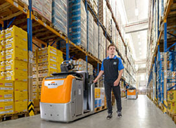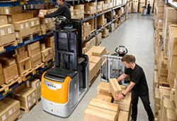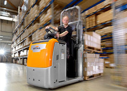 Les nombreuses possibilités offertes sur la gamme OPX permettent de répondre aux demandes spécifiques : par exemple pour des clients qui préparent des commandes au premier niveau, une plate-forme élevable hydrauliquement est disponible en option jusqu’à une hauteur de 1,20 m. La hauteur de préhension atteint ainsi 2,80 m en toute sécurité. Le volant EASY Drive de STILL s’élève avec la plate-forme. L’opérateur peut donc conduire l’appareil avec la plateforme au premier niveau. Une « conduite en diagonale », à savoir une déplacement et levée/descente simultanée de la plateforme, fait gagner du temps au client dans sa préparation de commandes et augmente considérablement la capacité de préparation et/ou de prélèvement », explique Thomas A. Fischer. Pour une préparation de commandes occasionnelle au premier niveau, le client dispose en option d’une marche rabattable qui est une alternative économique.