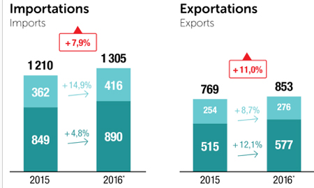 Les importations ont progressé moins rapidement (+ 4,8%) que les exportations (+ 12,1%) qui totalisent un chiffre d’affaires de 853 millions d’euros.