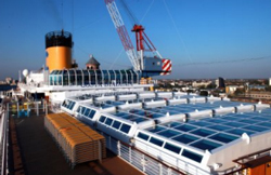 Spécifiquement conçus pour chaque bateau, les Skydomes Navim se démarquent du reste du portefeuille de produits de l’équipementier expérimenté de bateaux de passagers. Ces élégants toits vitrés coulissants sont composés de nombreux segments amovibles et sont équipés d’un moteur. Lorsqu’ils sont complètement fermés, ils protègent du vent et de la pluie et permettent la climatisation du pont supérieur.. Les toits en verre confèrent une valeur supplémentaire aux bateaux de croisière, car ils permettent l’utilisation des piscines extérieures, qui constituent la principale attraction pour de nombreux voyageurs, tout au long de l’année. Ils s’ouvrent et se ferment en douceur et silencieusement au moyen d’entraînements NORD spécialement configurés. Deux ou quatre motoréducteurs à arbres parallèles sont utilisés en fonction de la portée et du poids des toits. En plus de faire état d’une résistance élevée aux environnements marins, ces entraînements doivent supporter l’atmosphère saturée en chlore qui règne autour de la piscine. Mais ils doivent avant tout fonctionner sans accroc pendant de nombreuses années, car une fois le toit installé, il est difficile d’y accéder pour procéder à des opérations de maintenance ou de réparation.