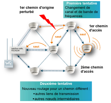 Jusqu’à 3 sauts sont autorisés entre l’interface radio et les détecteurs les plus éloignés et au moins deux chemins différents sont toujours possibles pour les échanges d’informations.
